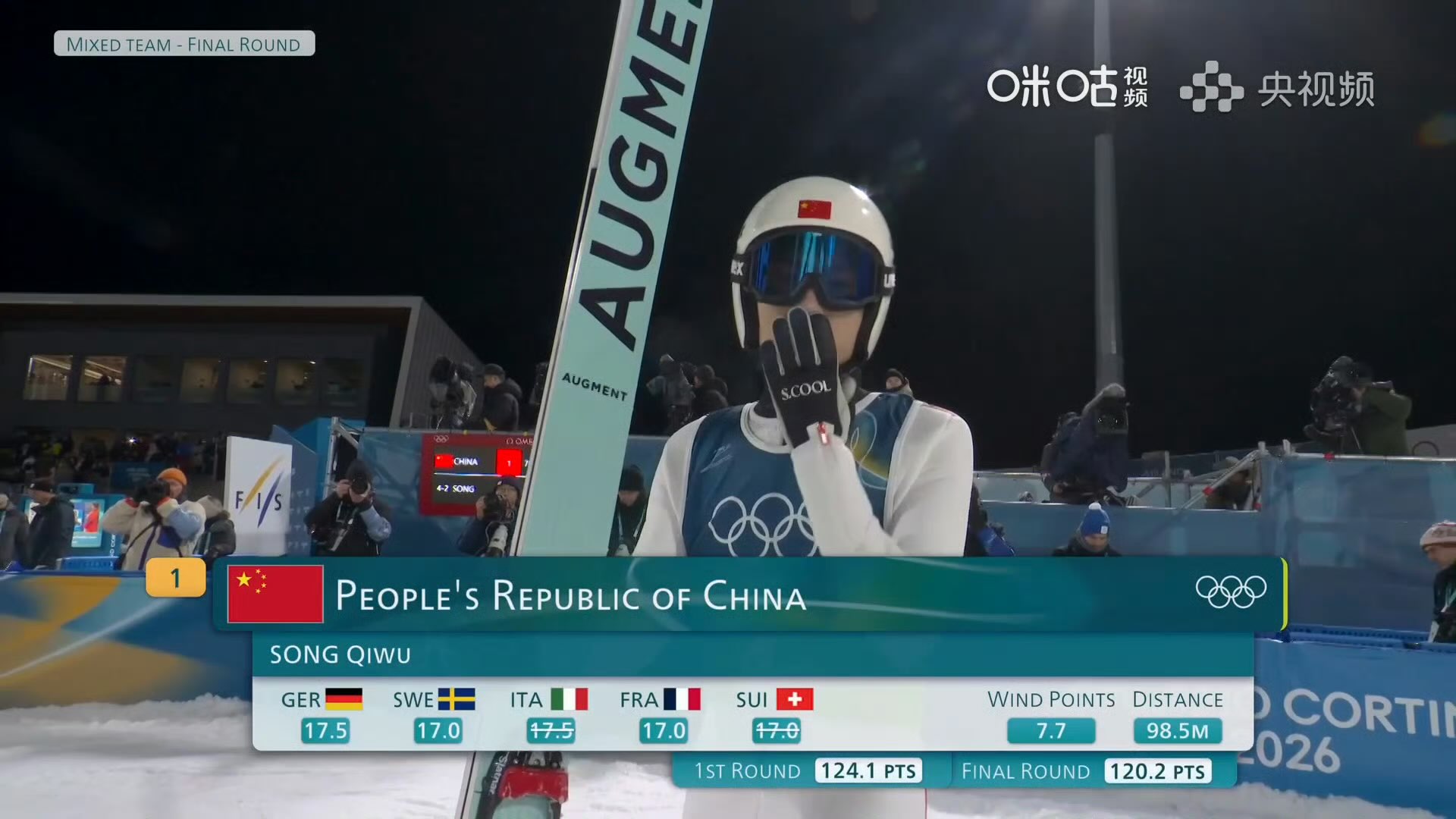 北京时间2月11日凌晨,2026年米兰-科尔蒂纳冬奥会在普雷达佐跳台滑雪场-标准台迎来跳台滑雪混合团体赛,中国选手曾坪、宋祺武、刘奇和赵嘉文搭档出战,凭借预赛460.5分名列第7创历史晋级8强,决赛轮累计924.1分,最终锁定第8,创中国体育代表团冬奥会该项目最好成绩。斯洛文尼亚成功卫冕,挪威与日本分别锁定亚军和季军。