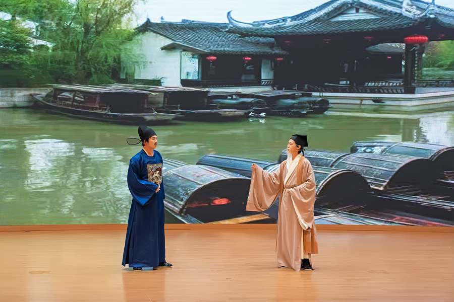 “阳明剧社阳明文化传习展演的精彩演绎,打破了传统单一的研讨模式,让抽象的哲学智慧变得可感、可触、可亲近。阳明剧社的同学们通过精湛的表演,将阳明心学的精髓娓娓道来。”昨晚,作为2025阳明文化活动月重要组成部分,绍兴文理学院阳明剧社阳明文化传习展演在风则江大讲堂上演。全国各地参加阳明心学大会的部分专家学者、第六届全国大学生阳明文化传习研讨营的青年学子,以及绍兴文理学院师生600余人共同观赏了这场融学术性、艺术性与思想性于一体的文化盛宴。